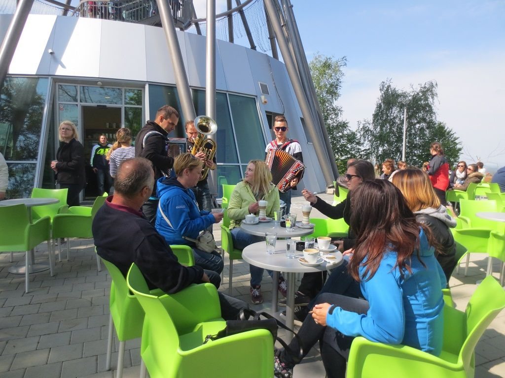 Naslednja postaja je bil zelo obiskan razgledni stolp. Čeprav smo bile najavljene, smo morale malo počakati. A vsaka slaba stran ima nekaj dobrega. Tako smo se v tem času spoznale mlade muzikante, ki so dobro voljo širili s poskočno glasbo. Po naključju so bili skupina gasilcev iz Velenja. Sledil je čudovit razgled po pokrajini. Pestra paleta barv, prečudovita narava, vmes se vijuga cesta, nekaj hišk in to do koder ti seže pogled. Povsem nekaj drugega kot Pariz, kjer je mesto do koder ti seže pogled.